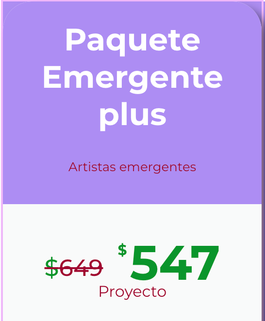 Nuestro Paquete Emergente Plus está diseñado especialmente para artistas que están comenzando y quieren lanzarse con una base sólida en el mundo digital. Con este paquete, te ayudamos a construir una presencia profesional y atractiva que capte la atención de tu audiencia y te prepare para el éxito.